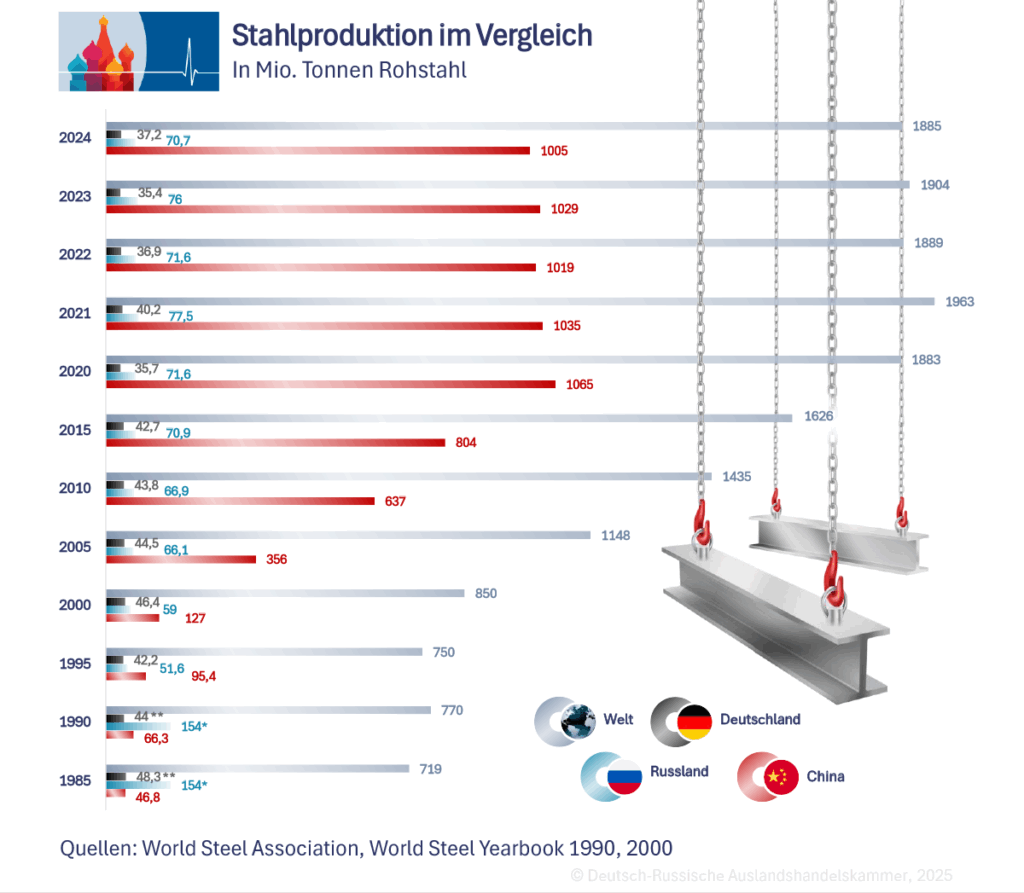 Auch die globale Stahlproduktion war 2024 schwach. Sie fiel gegenüber dem Vorjahr um 1% auf 1,88 Mrd. Tonnen Rohstahl, was dem Niveau des Pandemiejahrs 2020 entsprach. Allerdings verzeichnete Russland unter allen führenden Stahlnationen den größten Produktionsrückgang. Weil auch sein engster Verfolger, Südkorea, seinen Ausstoß um fast 5% auf 63,6 Mio. Tonnen verringerte, behauptete Russland seinen Platz in den Top-5 der weltgrößten Produzenten. Mit großem Abstand auf Platz 7 folgte Deutschland, das 2024 seine Produktion nach zwei Jahren des Schrumpfens um 5% auf 37,2 Mio. Tonnen steigerte. Mehr Stahl als Russland produzierten die USA (79,5 Mio. Tonnen), Japan (84 Mio. Tonnen) und Indien (149 Mio. Tonnen). China überragte mit erneut mehr als 1 Mrd. Tonnen den Rest der Stahlwelt. Seit etwa zehn Jahren leistet die „Fabrik der Welt“ mehr als die Hälfte der globalen Stahlproduktion.