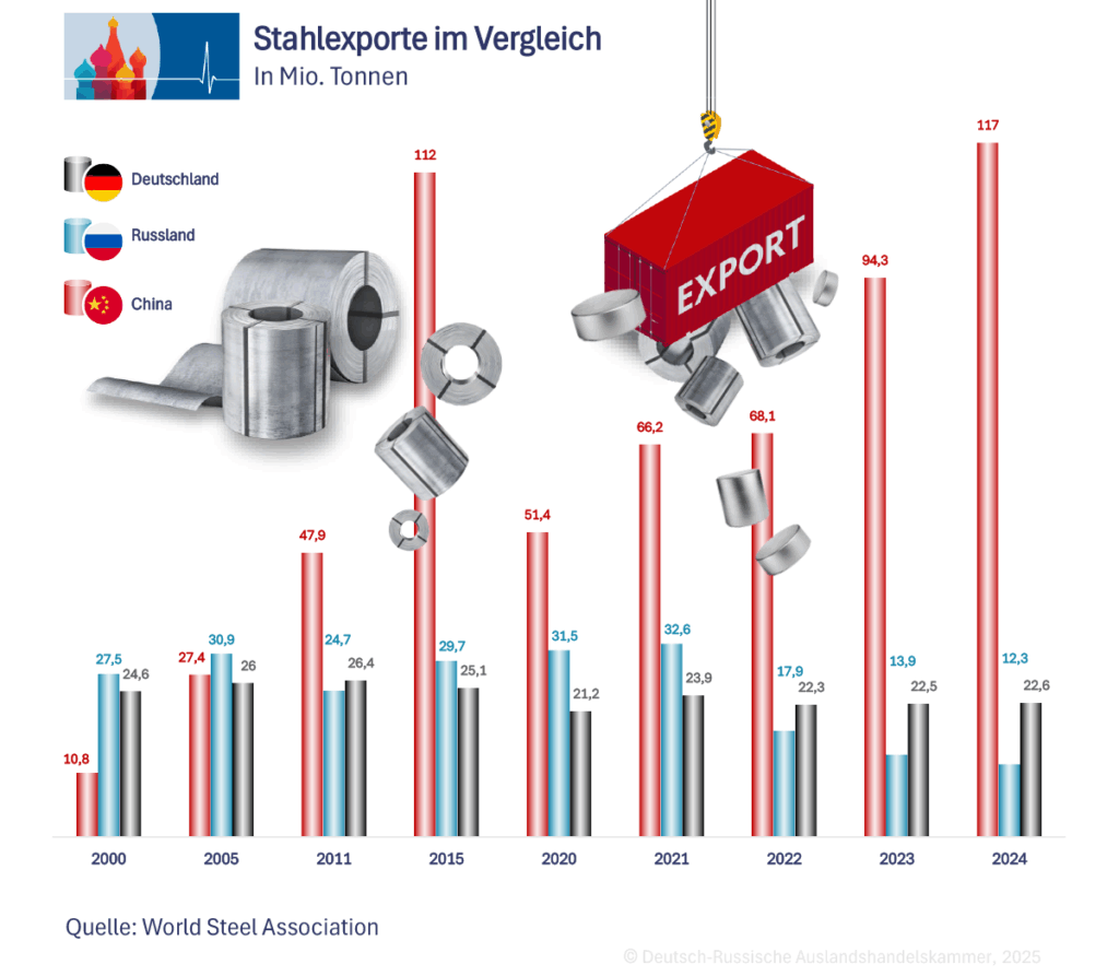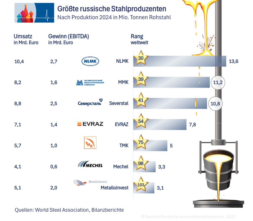 Im laufenden Jahr ist die Produktion sowohl weltweit als auch in Russland weiter rückläufig. World Steel beziffert den Rückgang in den ersten neun Monaten des Jahres global auf minus 1,6%. Für Russland berichtet der Moskauer Branchendienst Korporation Tschermet eine Produktion von 50,8 Mio. Tonnen Rohstahl von Januar bis September, was um 5% unter dem Vorjahreswert liegt. Die Analysten bemerken zugleich, dass die Produktion seit Juni im Vergleich zum Vorjahr nicht weiter fällt. Expertenprognosen zur russischen Produktion im Gesamtjahr 2025 bewegen sich zwischen 66 Mio. und 68 Mio. Tonnen, was einem Minus von 4% bis 7% entspräche.
