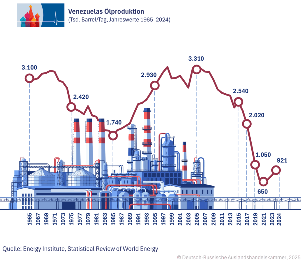 Venezuela besitzt mit rund 300 Mrd. Barrel die größten nachgewiesenen Ölreserven der Welt – mehr als Saudi-Arabien oder Russland und die USA zusammen. Doch diese Reserven liegen größtenteils in Form extrem schweren, teerartigen Rohöls vor und erfordern aufwendige Förderung und Raffination. Nach Jahren der Misswirtschaft, Sanktionen und politischer Isolation produziert das Land nur noch rund 900.000 Barrel pro Tag. Zum Vergleich: 2016 waren es noch 2,4 Mio. Barrel, Ende der 1990er Jahre sogar über drei Millionen.