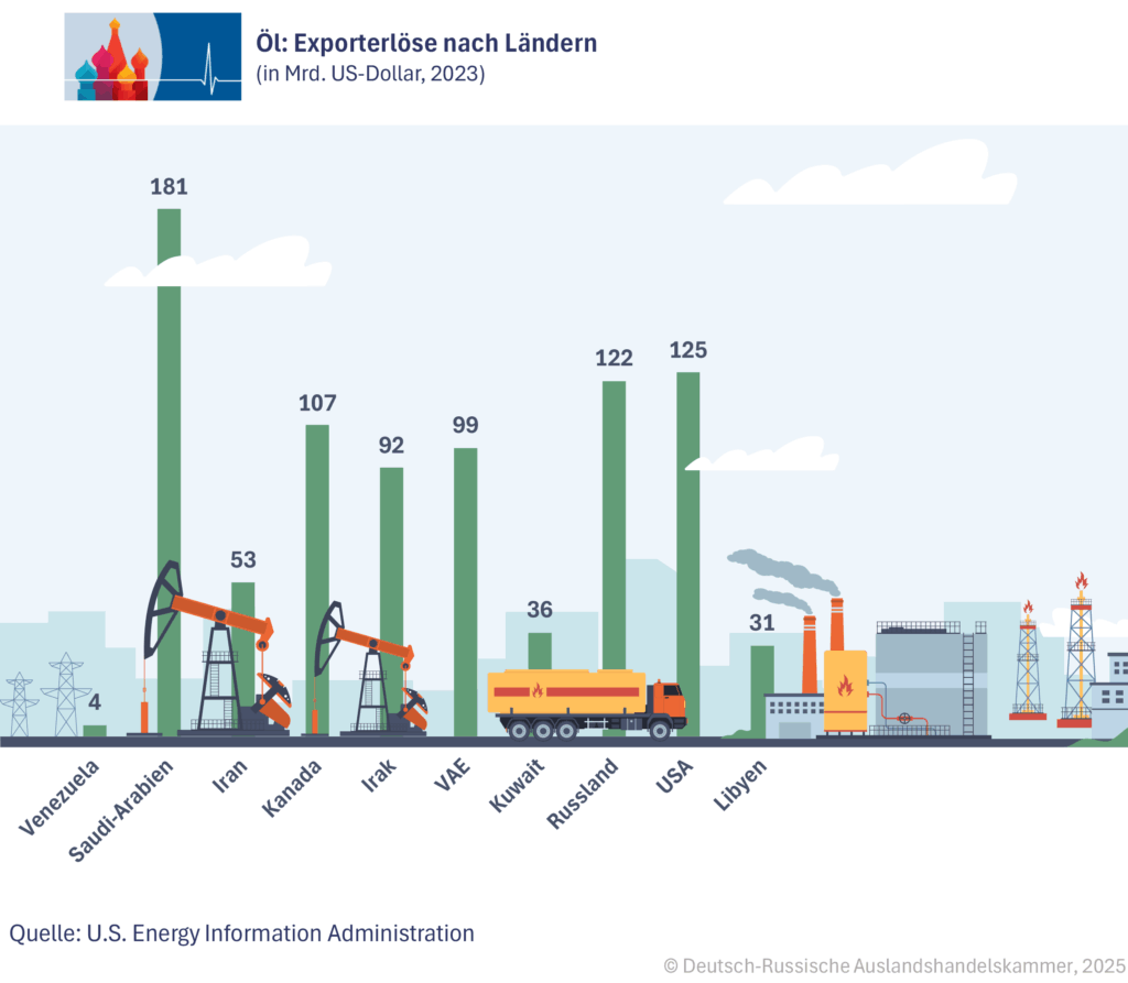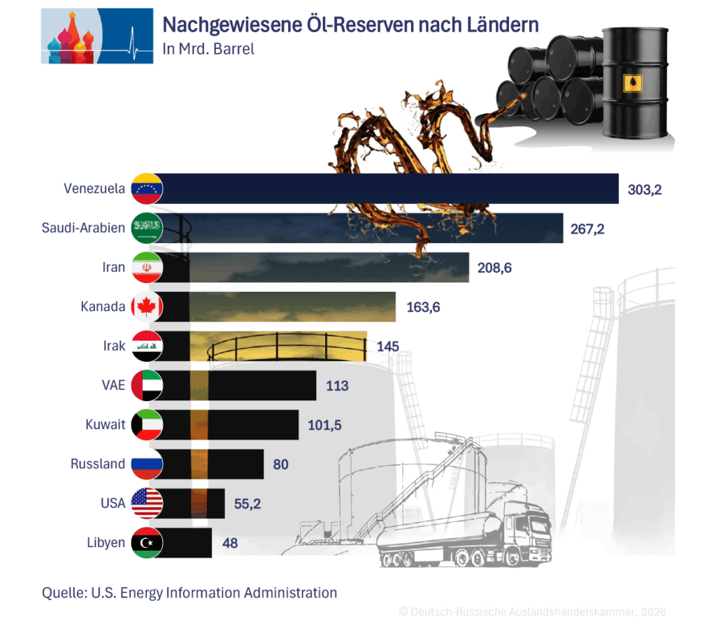 Während US-Aktien nach der Gefangennahme von Maduro profitieren, verlieren russische Werte großer Öl-Konzerne wie Rosneft und Lukoil. In den ersten elf Monaten 2025 brachen die Einnahmen aus dem Öl- und Gassektor um 23% auf nur noch acht Billionen Rubel – umgerechnet rund 84 Mrd. Euro – ein. Zwar ist der Anteil der Einnahmen aus Öl- und Gasexporten am Staatshaushalt von früher rund 40% auf unter 25% gefallen, dennoch ist das Öl eines der wichtigsten Geschäftsfelder Russlands. Russland fördert weiterhin rund ein Zehntel des weltweiten Öls und bleibe damit unverzichtbar, schreibt die deutsche Tageszeitung „Die Welt“. Russlands Rolle aber habe sich grundlegend verändert, sagt die Energieexpertin Tatijana Mitrova vom Center for Global Energy der amerikanischen Columbia Universität. Früher sei Moskau gemeinsam mit Saudi-Arabien Taktgeber der Opec+ gewesen, eingebunden in globale Benchmarks und strategische Preissteuerung. Diese Position sei erodiert.