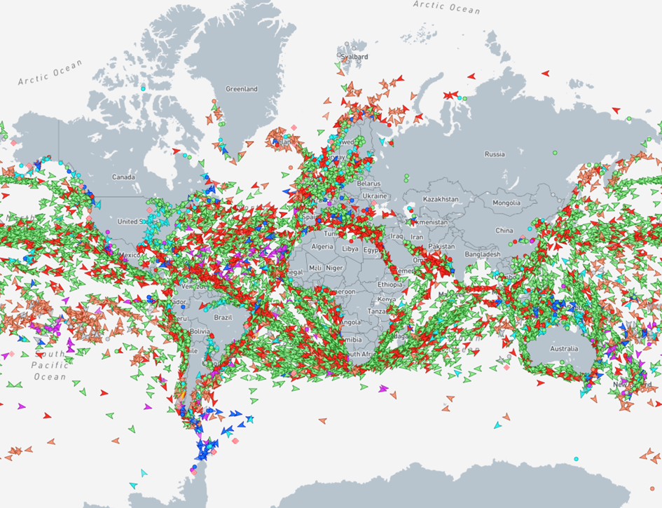 Legende: Cargo (Grün), Tanker (rot), Passagier (blau), Fischerei (Orange) (Quelle: Marine Traffic)