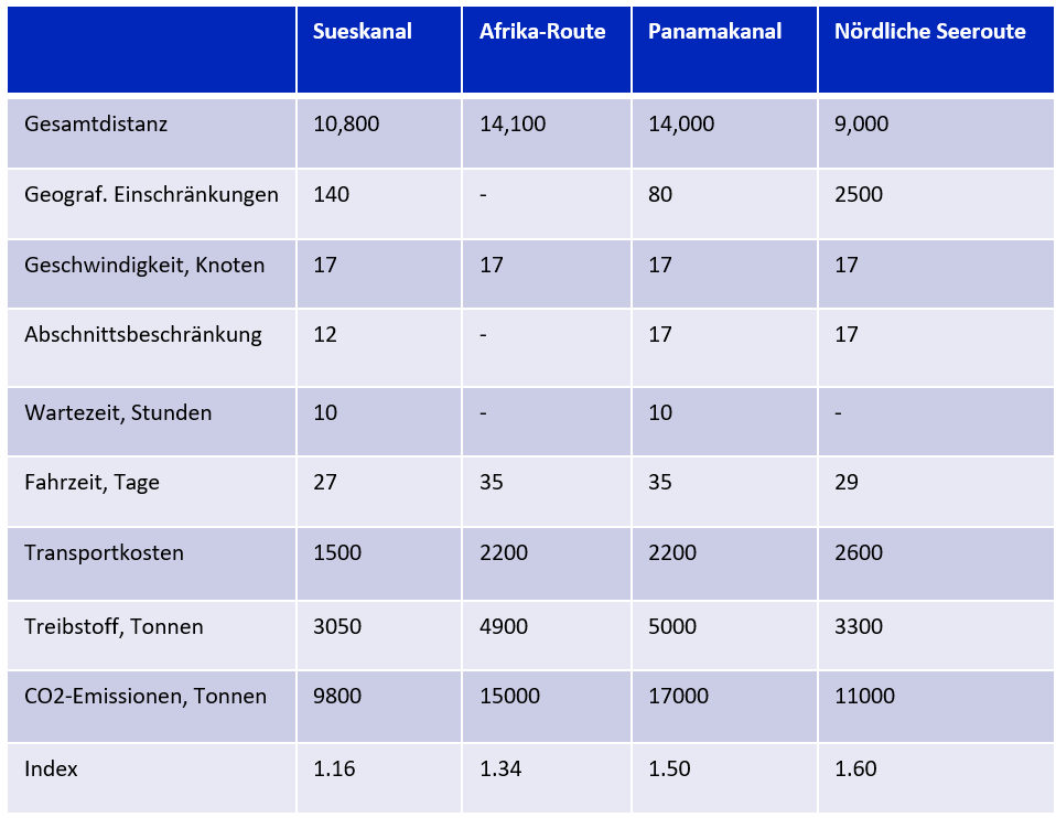 Eine Vergleichsstudie zwischen den Häfen Rotterdam und Shanghai unterstreicht dies. Untersucht wurden Distanz, Geschwindigkeit, Wartezeiten und Treibstoffverbrauch. Das Ergebnis ist ein Transportindex, der umso günstiger ist, je näher er bei eins liegt. Die Route über den Suezkanal erzielt den besten Wert (1,16), gefolgt vom Umweg über das Horn von Afrika (1,34). Aufgrund der längeren Strecke liegt die Passage durch den Panamakanal nur auf Rang drei (1,50). Schlusslicht bleibt die nördliche Arktisroute (1,60).