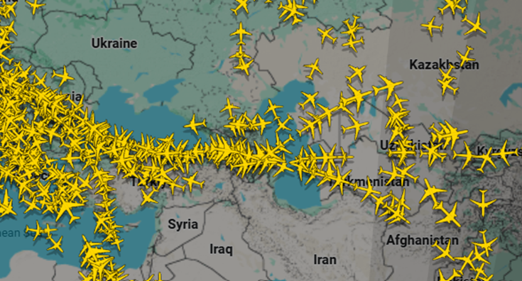 Flugreisen am 27. März 2026: Der Südkaukasus ist zur zentralen Achse des Luftverkehrs geworden (Quelle: Flightradar)