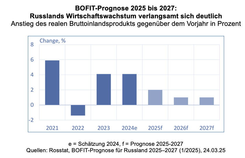 Eine so starke Verlangsamung des Wachstums der russischen Wirtschaft erwartet BOFIT, das „Institute for Emerging Economies“ der finnischen Zentralbank. Die Prognose des Instituts: 2025 wird sich Russlands Wirtschaftswachstum auf rund 2 Prozent halbieren und in den Jahren 2026 und 2027 wird es jeweils nur noch rund 1 Prozent erreichen.