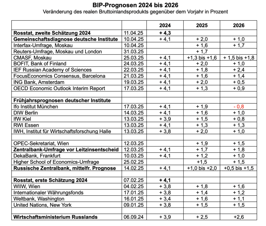 Die Wachstumsprognosen des finnischen Instituts für 2025 und 2026 decken sich mit den Erwartungen der fünf führenden deutschen Konjunkturforschungsinstitute. In ihrer am 10. April veröffentlichten „Gemeinschaftsdiagnose“ im Auftrag der Bundesregierung gehen auch sie davon aus, dass sich Russlands Wirtschaftswachstum 2025 auf 2,0 Prozent halbiert und 2026 nur noch 1,0 Prozent erreicht. Eine Prognose für das Jahr 2027, in dem BOFIT eine Stagnation der Wachstumsrate bei 1,0 Prozent erwartet, erstellten die deutschen Institute noch nicht.