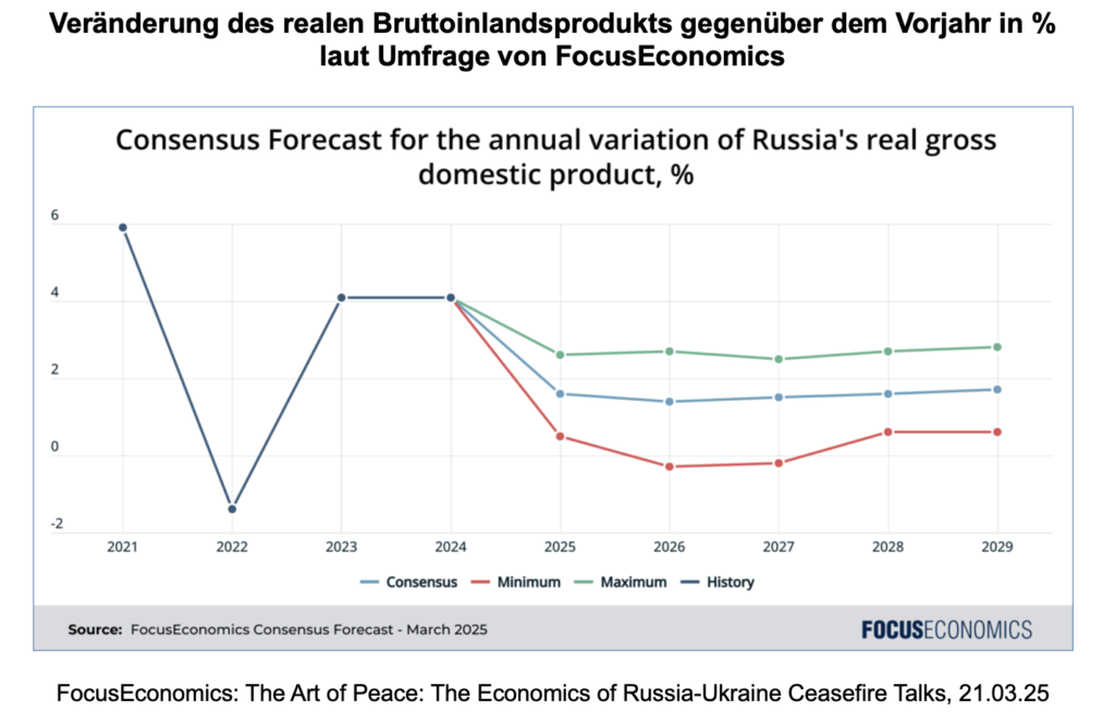 FocusEconomics hat Prognosen bis 2029 erfragt. Wie die folgende Abbildung aus einer Studie von FocusEconomics zu den wirtschaftlichen Aspekten der Gespräche über einen Waffenstillstand in der Ukraine zeigt, dürfte sich Russlands Wirtschaftswachstum bis 2029 laut dem „Consensus“ kaum beleben und unter 2 Prozent bleiben (blaue Linie).