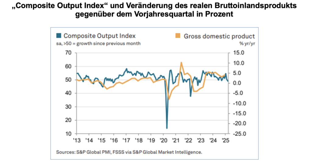 Der kombinierte Index von Industrie und Dienstleistungen, der „Composite Output Index“, fiel von 50,4 Indexpunkten im Februar auf 49,1 Indexpunkte im März. In der folgenden Abbildung wird die Entwicklung des „Composite Output Indexes“ (blaue Linie) mit der jährlichen Veränderungrate der Quartalswerte des realen Bruttoinlandsprodukts (orange Linie) verglichen. Die Abbildung zeigt: Einem deutlichen Rückgang des „Composite Output Indexes“ unter 50 Indexpunkte (linke Skala) folgt in der Regel eine Periode mit einem Rückgang der Vierteljahreswerte des realen Bruttoinlandsprodukts im Vorjahresvergleich (rechte Skala).