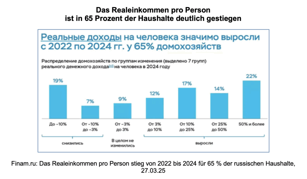 Der russische Ministerpräsident Michail Mischustin wies in seinem Bericht zur Arbeit der Regierung im Jahr 2024 in der Staatsduma am 26. März (Video mit deutscher Übersetzung) unter anderem darauf hin, dass die Realeinkommen der Bevölkerung 2024 um 8,5 Prozent gestiegen seien (Lenta.ru, TASS). 2023 waren sie laut Rosstat um 5,8 Prozent gestiegen, nach einem Rückgang um 1 Prozent im Jahr 2022 (Finmarket.ru).