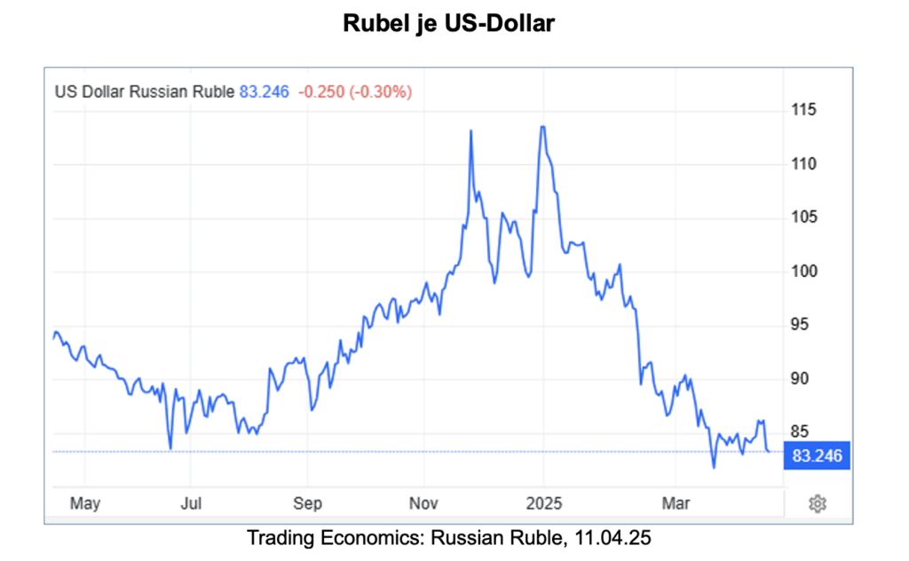 Derzeit ist der Rubel laut Reuters etwa 12 Prozent stärker als im Haushalt angenommen wurde. Ein unerwartet starker Rubel könnte, so Reuters, das russische Haushaltsdefizit im Jahr 2025 vergrößern und die Regierung zwingen, mehr Kredite aufzunehmen als geplant. Als Hintergrund für den Kursanstieg des Rubels nennt Reuters vor allem die Erwartung, dass nach der Aufnahme von Gesprächen zwischen den USA und Russland ein Abbau der geopolitischen Spannungen möglich sei. Die Analysten gehen davon aus, dass der Rubel bis Ende September von seinem aktuellen Stand von etwa 85 Rubel je US-Dollar auf 97 Rubel je US-Dollar fallen wird.