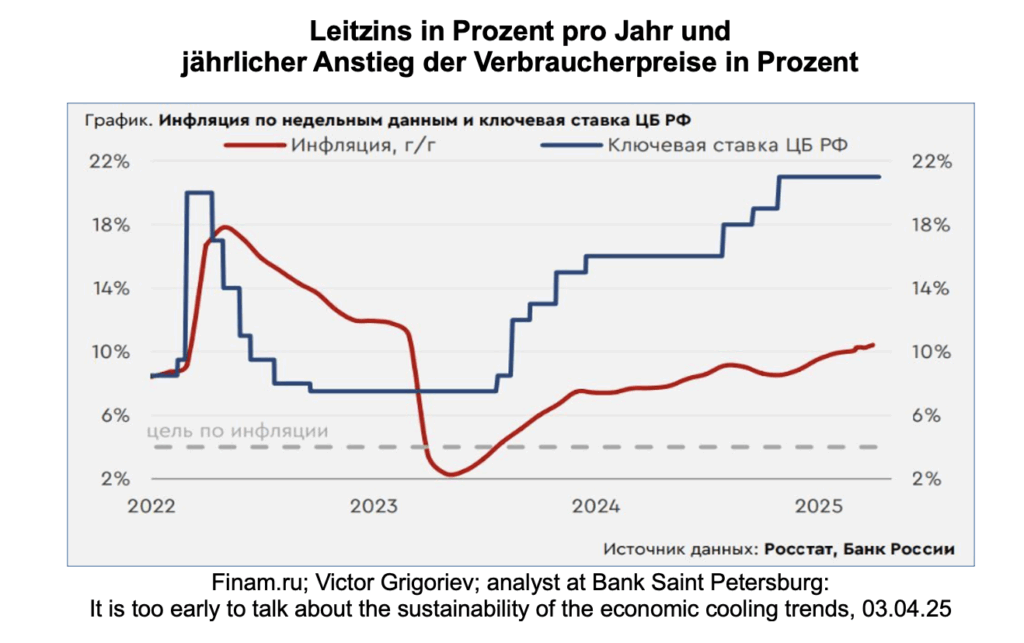 Laut Rosstat ist die jährliche Inflationsrate auch im gesamten Monat März auf 10,3 Prozent gestiegen (TradingEconomics). Trotz der Anhebung des Leitzinses auf 21 Prozent im Oktober 2024 (siehe dunkelblaue Linie) hat sich der Preisanstieg beim Vergleich zum Vorjahresmonat damit seit Oktober 2024 um 1,8 Prozentpunkte erhöht. Bei der Interfax Analysten-Umfrage Anfang April erwarteten die Teilnehmer, dass die jährliche Inflationsrate im Dezember 2025 noch 7,9 Prozent erreichen wird (Finmarket.ru).