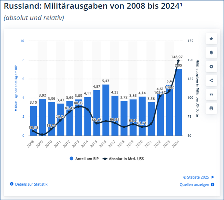 Die folgende Statista-Abbildung illustriert, wie stark die Militärausgaben Russlands bereits bis 2024 gestiegen sind. Die blauen Säulen zeigen, dass sich der Anteil der russischen Militärausgaben am Bruttoinlandsprodukt von 3,6 Prozent im Jahr 2021 bereits im Jahr 2024 auf 7,1 Prozent erhöht hat (siehe dazu Ostwirtschaft vom 01.12.25: „Ist Russland eine Kriegswirtschaft?“).