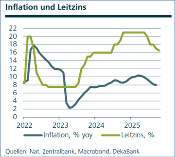 Die Zentralbank hob den Leitzins viel zu hoch an. Im Januar 2025 betrug der Nominalzins 21 Prozent bei einer Inflationsrate von 10,5 Prozent, was einen Realzins von 10,5 Prozent implizierte – ein viel zu hoher Wert. Die Realzinsen hätten nur auf 4 oder 5 Prozent angehoben werden dürfen.