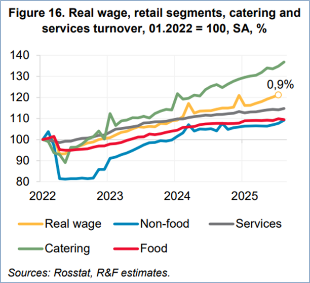 Die Einschätzungen Sapirs zur Reallohnentwicklung veranschaulicht die folgende Abbildung der russischen Zentralbank in ihrem jüngsten Konjunkturbericht „Talking Trends“. Sie zeigt den Anstieg der Reallöhne und wichtiger Bereiche des privaten Verbrauchs von Anfang 2022 bis zum August 2025 (Reallöhne bis Juli 2025).