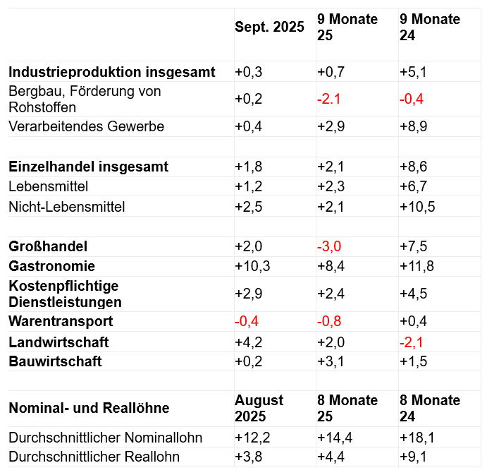 Der Produktionsanstieg im September gegenüber dem Vormonat August um 0,8 % war laut dem VEB-Institut der stärkste Anstieg seit Anfang 2025. Ohne ihn hätte die gesamtwirtschaftliche Produktion im dritten Quartal nicht auf dem Niveau des zweiten Quartals stagniert, sondern wäre gegenüber dem Vorquartal gesunken.