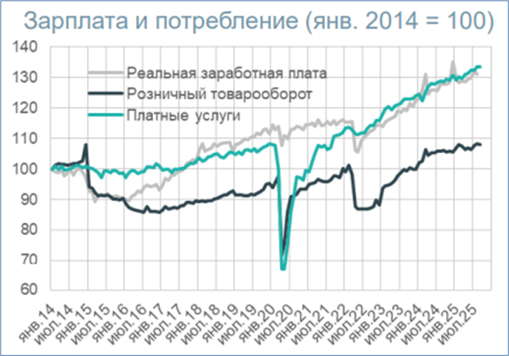 Das VEB-Institut weist darauf hin, dass sich laut Rosstat das bisherige sehr starke jährliche Wachstum des realen verfügbaren Einkommens im dritten Quartal 2025 auf +8,5% verlangsamte. Im zweiten Quartal 2025 hatte der Anstieg sogar +10,4 Prozent erreicht. Im Jahresvergleich 2024/2023 warem die verfügbaren Realeinkommen um 7,3 Prozent gestiegen.
