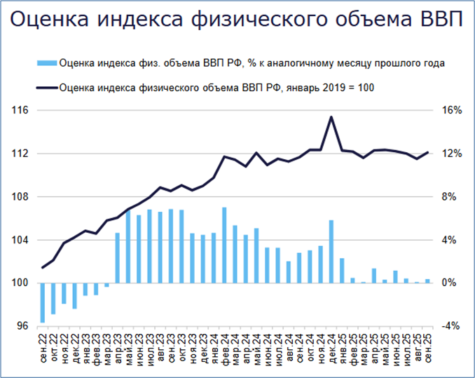 Im September 2025 war das saisonbereinigte reale BIP laut den ersten Berechnungen des Instituts der Russischen Akademie der Wissenschaften 0,2 Prozent niedriger als im Januar 2025. Es lag damit auf dem bereits im Mai 2024 erreichten Niveau.
