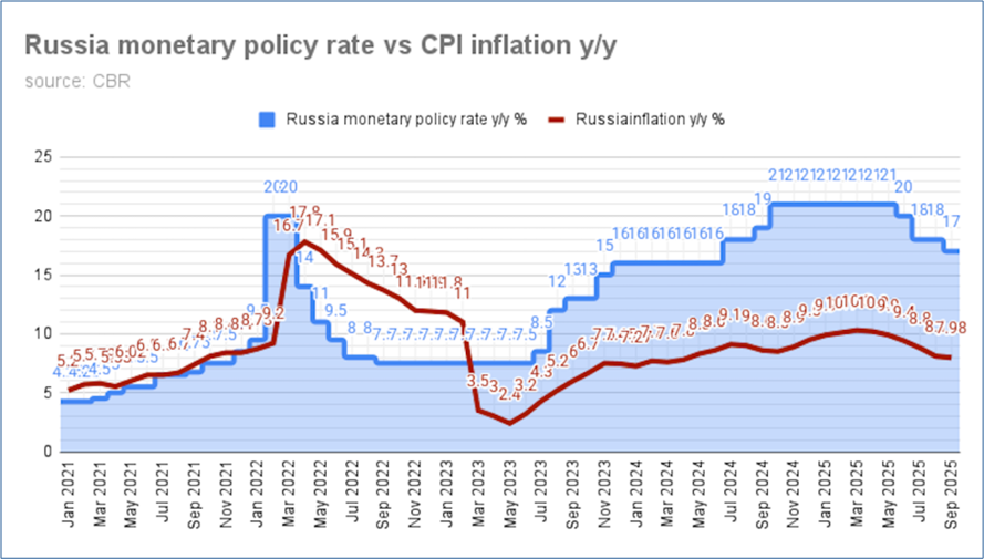 Am 06. November veröffentlichte die Zentralbank weitere Informationen zu ihrer Leitzinsentscheidung und einen detaillierten Kommentar zu ihrer „Mittelfristigen Prognose“. Nach Einschätzung der Zentralbank deuten aktuelle Daten darauf hin, dass sich das jährliche Wachstum des realen Bruttoinlandsprodukts im dritten Quartal 2025 auf nur noch +0,4% verlangsamt hat. Im Juli hatte die Zentralbank noch erwartet, dass die russische Wirtschaft im dritten Quartal im Vorjahresvergleich um +1,6% wächst.