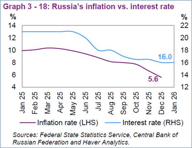 Russlands Inflation ist, so BOFIT, durch die restriktive Geldpolitik eingedämmt worden. Die Zentralbank habe ihren Leitzins in der zweiten Jahreshälfte zwar schrittweise gesenkt. Der Leitzins sei aber auch am Jahresende 2025 mit 16% noch „sehr hoch“ gewesen.