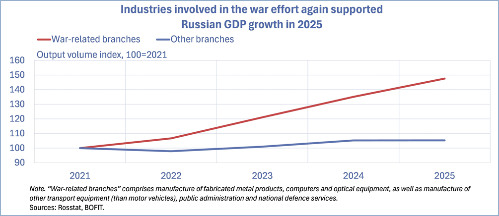 Die folgende BOFIT-Abbildung zeigt, dass die Produktion dieser Branchen im Jahr 2025 unverändert stark gestiegen ist. Im Vergleich zum Jahr 2021, dem Jahr vor dem Beginn des Ukraine-Krieges, hat sie sich um knapp 50% erhöht. Die Produktion in den übrigen Branchen hat laut BOFIT im letzten Jahr stagniert.