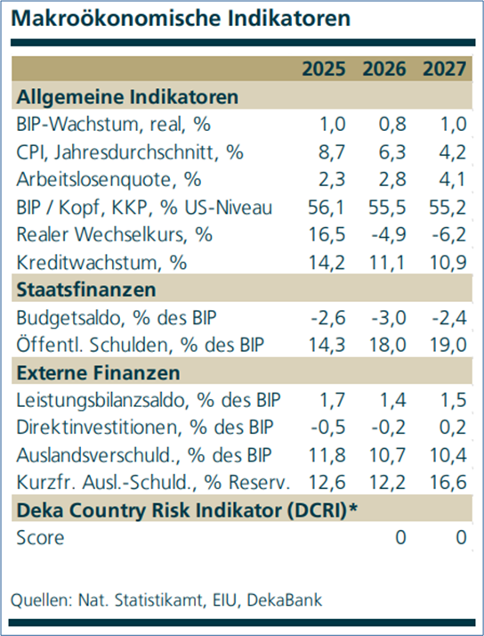„Wie stark die Zentralbank die Geldpolitik weiter lockern kann, bleibt aber offen, denn 2026 wurden einige Steuern und Abgaben angehoben, um das wachsende Budgetdefizit zu finanzieren. Insbesondere die Anhebung der Mehrwertsteuer um 2 Prozentpunkte auf 22% sorgt für einen Inflationsanstieg und kann im Hinblick auf die instabilen Inflationserwartungen für Zweitrundeneffekte sorgen. In der ersten Jahreshälfte dürften die Zentralbank entsprechend vorsichtig und der zivile Sektor der Wirtschaft weiter unter Druck bleiben.“