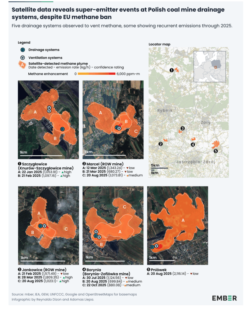 Ember stützt sich auf Satellitendaten, die Methanfahnen über mehreren polnischen Bergwerken dokumentieren. Demnach entfielen 2025 rund 96 Prozent der beobachteten Methanemissionen aus europäischer Onshore-Energieinfrastruktur auf Standorte in Polen. Besonders betroffen seien Untertage-Kokskohlebergwerke.