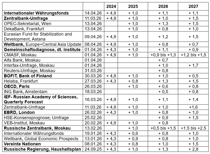 Der Unterschied der Wachstumsprognosen von IWF und Weltbank für 2026 ist mit 0,3 Prozentpunkten aber gering. Die Prognosen von IWF und Weltbank liegen mit 1,1 Prozent und 0,8 Prozent etwa in der Mitte der Spanne von 0,5 bis 1,5 Prozent, die die russische Zentralbank im Februar für das diesjährige Wachstum der russischen Wirtschaft genannt hat. Am nächsten Freitag wird die Zentralbank bei der Aktualisierung ihrer „Mittelfristigen Wirtschaftsprognosen“ anlässlich ihres Leitzinsentscheides vermutlich bei dieser Wachstumsprognose bleiben. Dafür spricht jedenfalls das Ergebnis der Analysten-Umfrage, die die Zentralbank zur Vorbereitung der Leitzinsentscheidung wieder durchführte. Dabei ergab sich, dass die rund 30 Teilnehmer im Mittelwert weiterhin davon ausgehen, dass die russische Wirtschaft 2026 wie bereits 2025 um 1,0 Prozent wachsen dürfte.