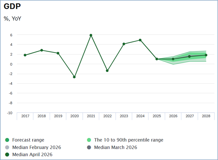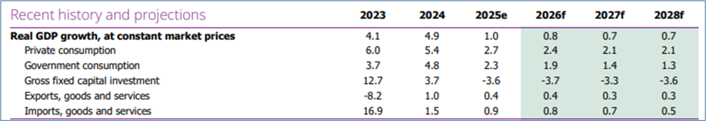 Das Wachstum des realen Bruttoinlandsprodukts dürfte sich 2026 auf 0,8 Prozent verlangsamen. Infolge der restriktiven Geldpolitik und höherer Mehrwertsteuersätze verlangsamt sich der Anstieg des Konsums.