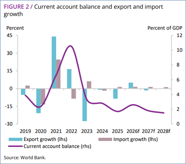 Der Leistungsbilanzüberschuss wird dank der gestiegenen Energiepreise im Jahr 2026 voraussichtlich auf 2,6 Prozent des BIP steigen (siehe violette Linie in der folgenden Abbildung). In den Jahren 2027–2028 dürfte er sich aufgrund sinkender Energiepreise wieder verringern.
