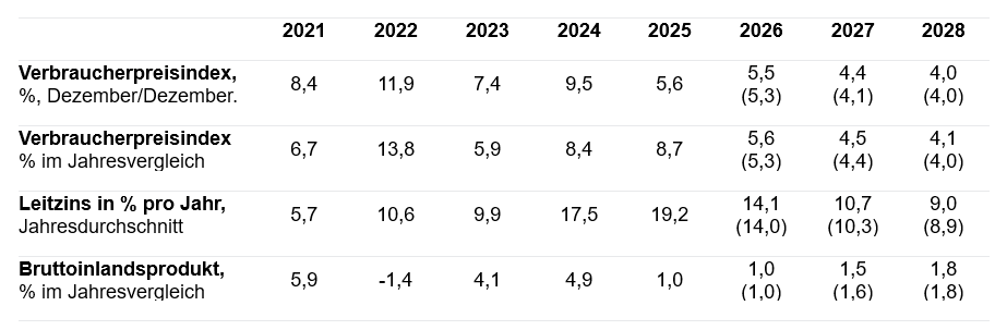 Der Leitzins wird im laufenden Jahr im Jahresdurchschnitt mit 14,1 Prozent um gut 5 Prozentpunkte niedriger sein als 2025 (19,2 Prozent).