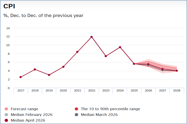 Das Tempo des Rückgangs der Inflationsrate wird sich wegen der erwarteten starken Inflationsimpulse aus dem Ausland im Jahr 2026 voraussichtlich verlangsamen. Mittelfristig wird der Anstieg der Verbraucherpreise aber sinken, Voraussichtlich 2028 wird das Inflationsziel der Zentralbank von 4 Prozent erreicht werden. Die preistreibenden externen Faktoren werden allmählich wegfallen.