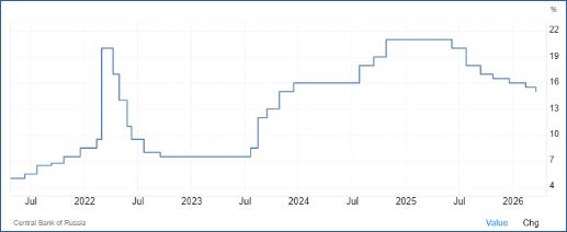Die russische Zentralbank senkte am Freitag ihren Leitzins erneut um 0,5 Prozentpunkte auf jetzt 15,0 Prozent. Es war die zweite Senkung in diesem Jahr und die siebte seit Juni 2025. Damals begann die Zentralbank mit der Senkung des Leitzinses von einem langjährigen Höchststand von 21 Prozent. Die hohen Zinsen sollten die Inflation dämpfen, die von stark steigenden Rüstungsausgaben in die Höhe getrieben wurde. Jetzt soll mit niedrigeren Zinsen das 2025 von 4,9 Prozent auf 1 Prozent gesunkene Wachstum der russischen Wirtschaft stabilisiert werden.