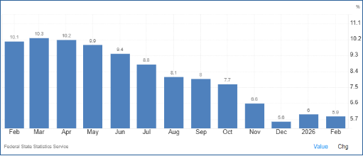 - Finmarket.ru: Die Inflation in Russland betrug im Februar 0,73 %, die jährliche Rate 5,9 %, 13.03.26
