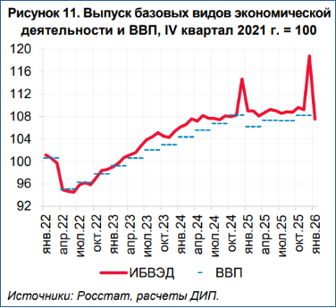 Der Produktionsentwicklung in den „Kernbereichen“ der Wirtschaft vergleicht die Zentralbank in der folgenden Abbildung mit der Entwicklung des saison- und kalenderbereinigten Indexwertes des gesamten realen Bruttoinlandsprodukts (4. Quartal 2021 = 100). Laut Schätzung der Zentralbank dürfte die gesamtwirtschaftliche Produktion im vierten Quartal 2025 höher gewesen sein als im dritten Quartal. Das zeigt die gestrichelte blaue Linie. Rosstat wird revidierte vierteljährliche BIP-Daten für 2025 am 10. April veröffentlichen.