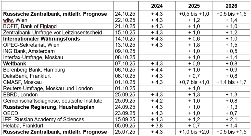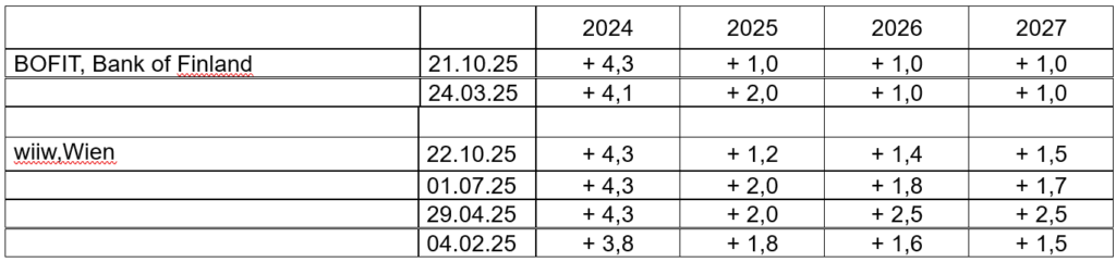 Das wiiw, das „Wiener Institut für Internationale Wirtschaftsvergleiche“, veröffentlicht vierteljährlich detaillierte Russland-Prognosen. Das Institut erwartet jetzt ein etwas stärkeres Wachstum als BOFIT. Das wiiw prognostiziert eine langsame Erholung der Wachstumsrate von +1,2 Prozent im Jahr 2025 auf +1,5 Prozent im Jahr 2027 (Pressemitteilung).