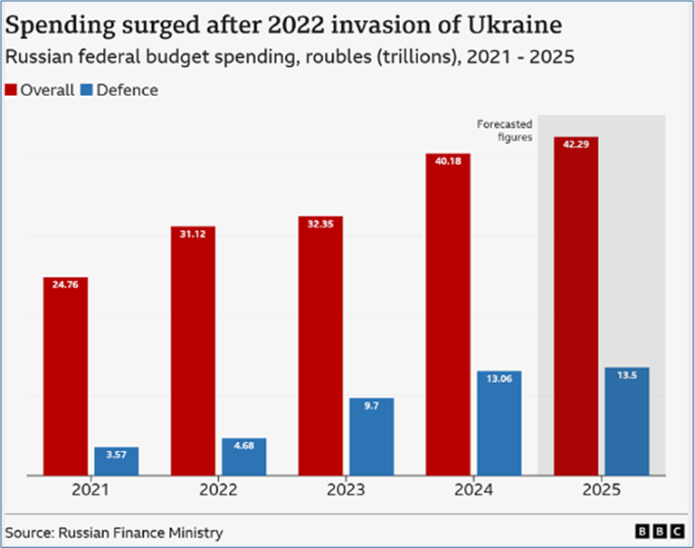 Die Finanzierung des Angriffskriegs gegen die Ukraine hat in den letzten drei Jahren laut BOFIT zu einem nominalen Wachstum der konsolidierten Haushaltsausgaben von durchschnittlich rund 17 % pro Jahr geführt. Im diesjährigen Bundeshaushalt hätten die Ausgaben für „Verteidigung“ und „Innere Sicherheit“ zusammen über 40 % der Gesamtausgaben ausgemacht.