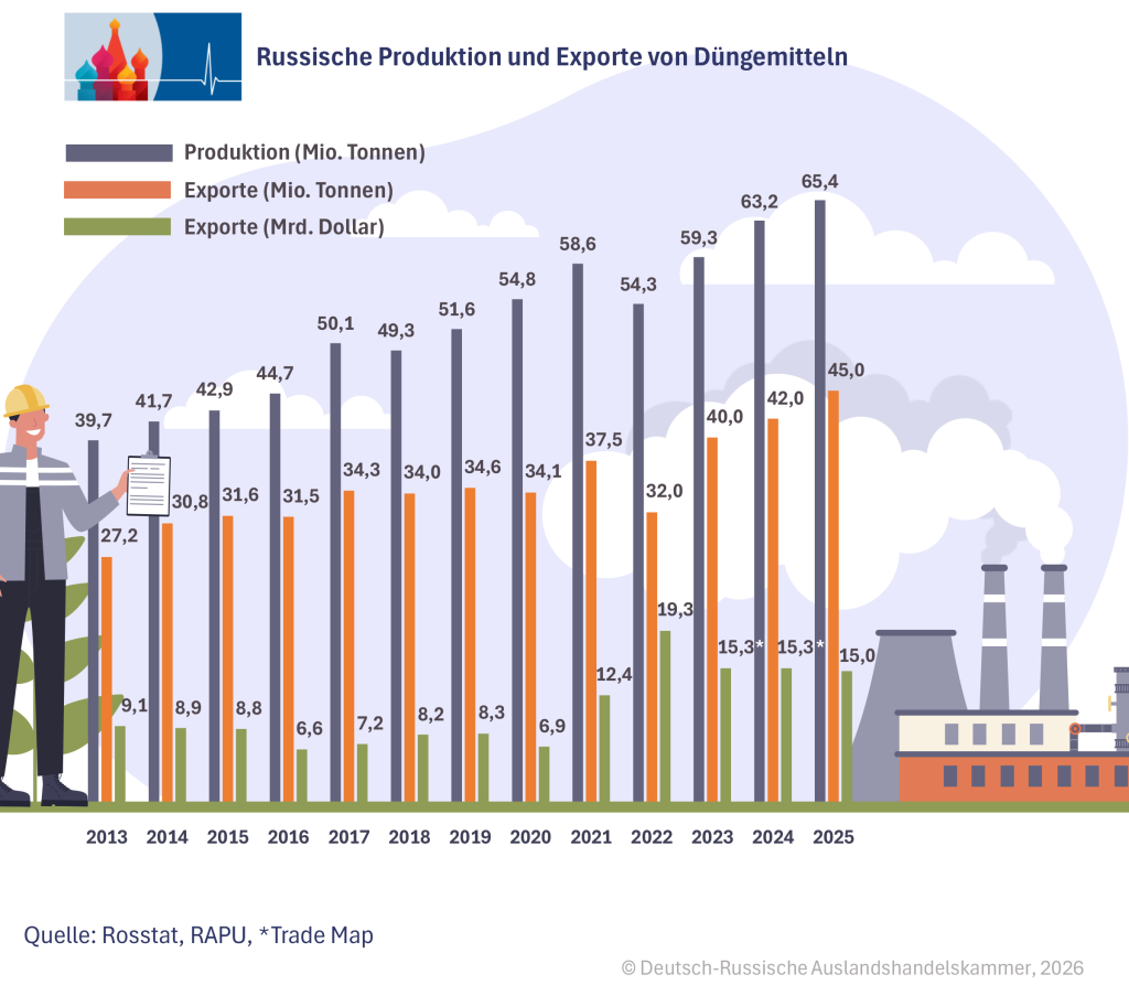 In den vergangenen Jahren hat Russland seine Düngemittelproduktion stark ausgebaut. 2013 belief sie sich noch auf 39,7 Mio. t Rohgewicht, bis 2030 rechnet RAPU mit einem weiteren Ausbau auf 80 Mio. t. Zum Vergleich: Der historische Rekord aus dem Jahr 1988 liegt bei 37,1 Mio. t, bezogen auf die gesamte damalige Sowjetunion. Diese Angabe erfasst nicht das Rohgewicht der Düngemittel, sondern nur die tatsächlich darin enthaltenen Nährstoffe, das sogenannte 100%-Nährstoffvolumen. Der entsprechende Wert für 2025 lag bei 30,5 Mio. t. Für die russische Teilrepublik der UdSSR ist in wissenschaftlichen Arbeiten eine Produktion von 17,3 Mio. t in 100%-Volumen im Jahr 1985 überliefert, was unter dem Resultat von 2013 in Höhe von 18,5 Mio. t lag.