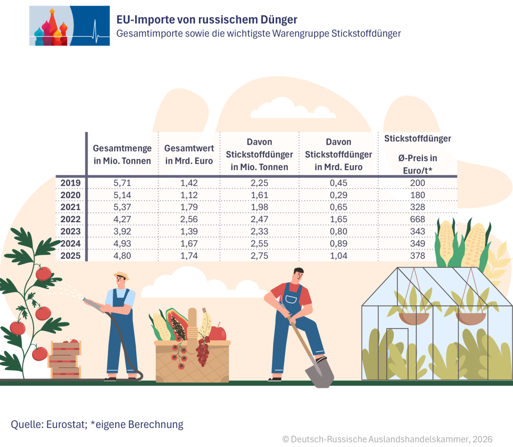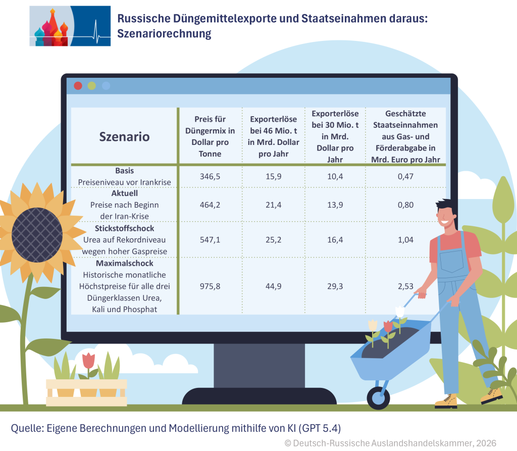 Im Krisenjahr 2022 waren die russischen Exporterlöse laut RAPU, dem Verband der russischen Düngemittelproduzenten, auf 19,3 Mrd. Dollar (16,8 Mrd. Euro) gestiegen, bei einem relativ niedrigen Exportvolumen von 32 Mio. t. Rechnerisch ergibt sich ein Durchschnittspreis von 603 Dollar pro Tonne. Die russischen Gesamtexporte im Jahr 2026 prognostizierte RAPU noch vor der Irankrise mit 46 Mio. t Düngemittel. Sollten die Preise über das gesamte Jahr hinweg das Niveau von 2022 erreichen, könnten die russischen Exporterlöse 2026 somit rechnerisch 27,7 Mrd. Dollar erreichen, umgerechnet 24 Mrd. Euro.