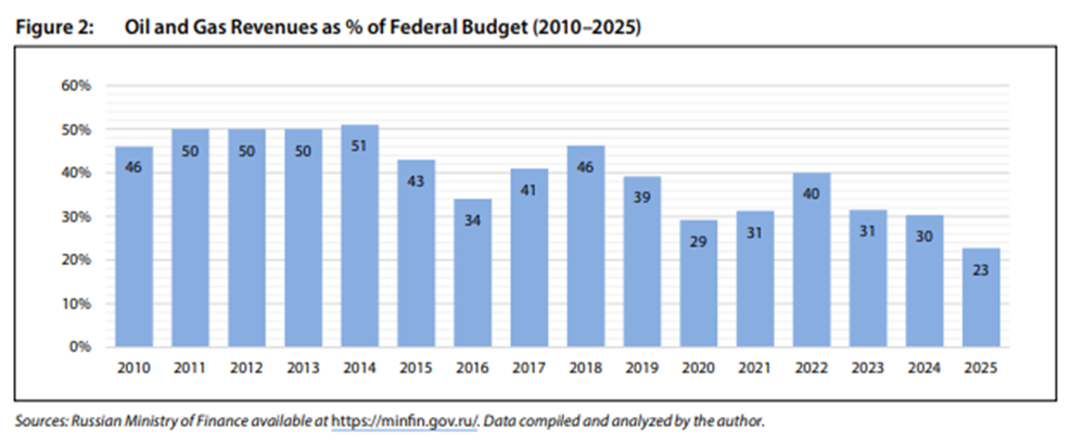 Seit 2018 hat sich der Anteil der Einnahmen aus dem Öl- und Gasbereich an den gesamten Einnahmen des Bundeshaushaltes bereits halbiert. Nach Angaben von Tatiana Mitrova (Global Fellow at the Center on Global Energy Policy Columbia University) sank er von 46 Prozent im Jahr 2018 auf 23 Prozent im Jahr 2025.