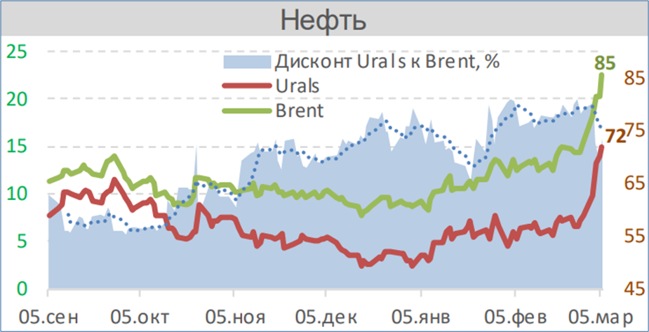 Als Folge des Krieges im Nahen Osten sind die Ölpreise stark gestiegen. Die folgende Abbildung aus dem am Freitag veröffentlichten Wochenbericht des Instituts der staatlichen russischen Entwicklungsgesellschaft VEB.RF zeigt: Der Preis von Brent-Öl stieg am 05. März auf rund 85 Dollar/Barrel. Russisches Urals-Öl wurde zu rund 72 Dollar/Barrel notiert. Der „Abschlag“ von Urals-Öl gegenüber Brent betrug damit rund 16 Prozent (graue Fläche, linke Skala in der folgenden Abbildung).