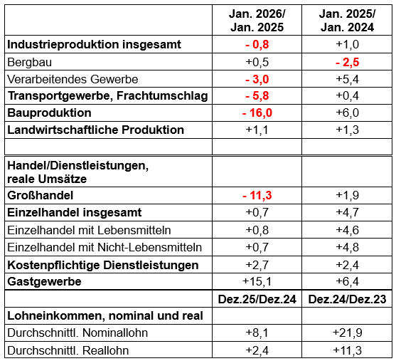 - Harte Zahlen: Tabelle: Entwicklung der wichtigsten Wirtschaftsindikatoren Mai 25 bis Jan. 26; 04.03.26