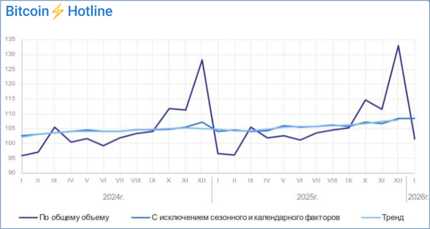 Im Januar 2026 stagnierte die Industrieproduktion laut einer ersten Schätzung des Statistikamtes Rosstat saison- und kalenderbereinigt auf dem im Dezember 2025 erreichten Niveau. Die Bitcoin-Hotline von Evgeny Kogan veröffentlichte dazu die folgende Kopie einer Rosstat-Abbildung. Die Stagnation des Indexes der saison- und kalenderbereinigen Produktion der Industrie zeigt die graue Linie, die teilweise von der von Rosstat berechneten hellblaue Trendlinie überlagert wird.