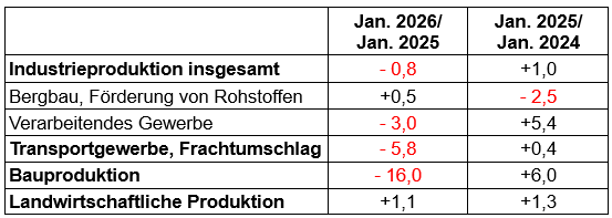 Der Rückgang der gesamten Industrieproduktion um 0,8 Prozent im Januar 2026 im Vorjahresvergleich ergab sich vor allem aus der Abnahme der Produktion im „Verarbeitenden Gewerbe“ um 3,0 Prozent.