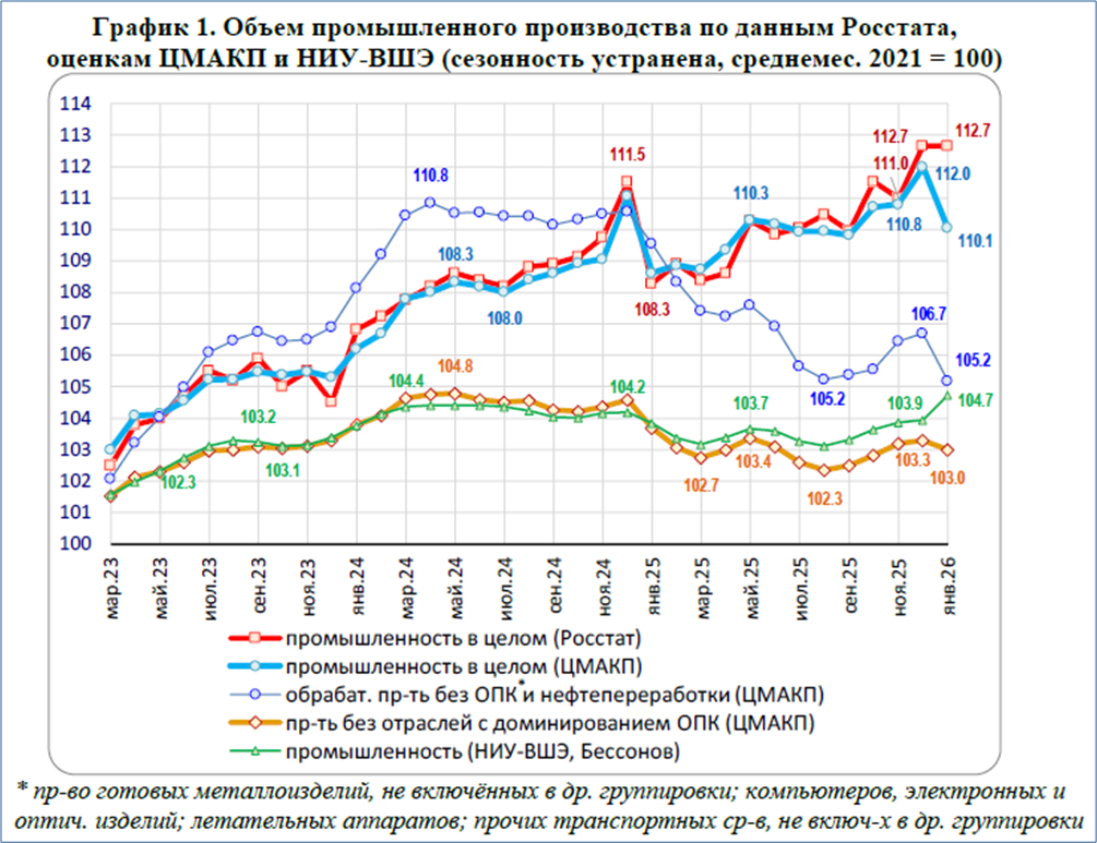 Während laut den ersten Rosstat-Schätzungen die Industrieproduktion im Januar 2026 saison- und kalenderbereinigt auf dem Niveau vom Dezember 2025 stagnierte, kamen andere Schätzungen zu deutlich anderen Ergebnissen. Das Moskauer „Zentrum für makroökonomische Analyse und Kurzfristprognose“ (CMASF) hat seine eigenen Schätzungen mit den Rosstat-Schätzungen und Schätzungen der Moskauer „Higher School of Economics“ (HSE) in der folgenden Abbildung verglichen.