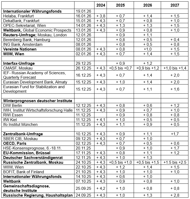Die von den Agenturen befragten Analysten erwarten im neuen Jahr im Durchschnitt eine leichte Belebung des russischen Wirtschaftswachstums auf 1,1 Prozent (Reuters) bzw. 1,2 Prozent (Interfax). Die Weltbank rechnet hingegen weiterhin damit, dass sich Russlands Wirtschaft 2026 noch etwas weiter auf 0,8 Prozent abschwächt. Die Wirtschaftsabteilung der Vereinten Nationen geht im Gegensatz dazu davon aus, dass Russland Wirtschaftswachstum in diesem Jahr von 0,8 Prozent auf 1,0 Prozent anzieht.