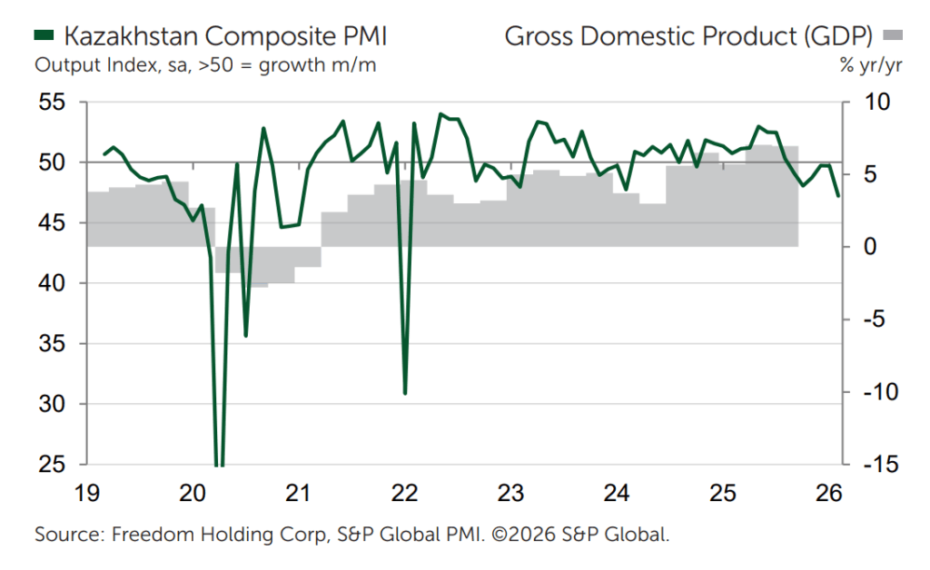 Der Dienstleistungssektor in Kasachstan hat im Februar deutlich an Schwung verloren. Besonders stark brachen die Neuaufträge ein – so stark wie seit fast vier Jahren nicht mehr. Das zeigt der aktuelle Einkaufsmanagerindex (PMI) von Freedom Holding und S&P Global.
